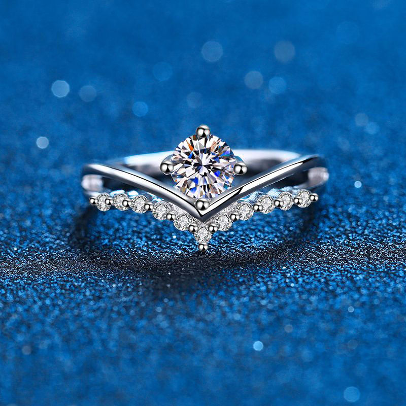 V Type 4 Prong Round Brilliant Diamonds Rings 14K White Gold Plated Moissanite